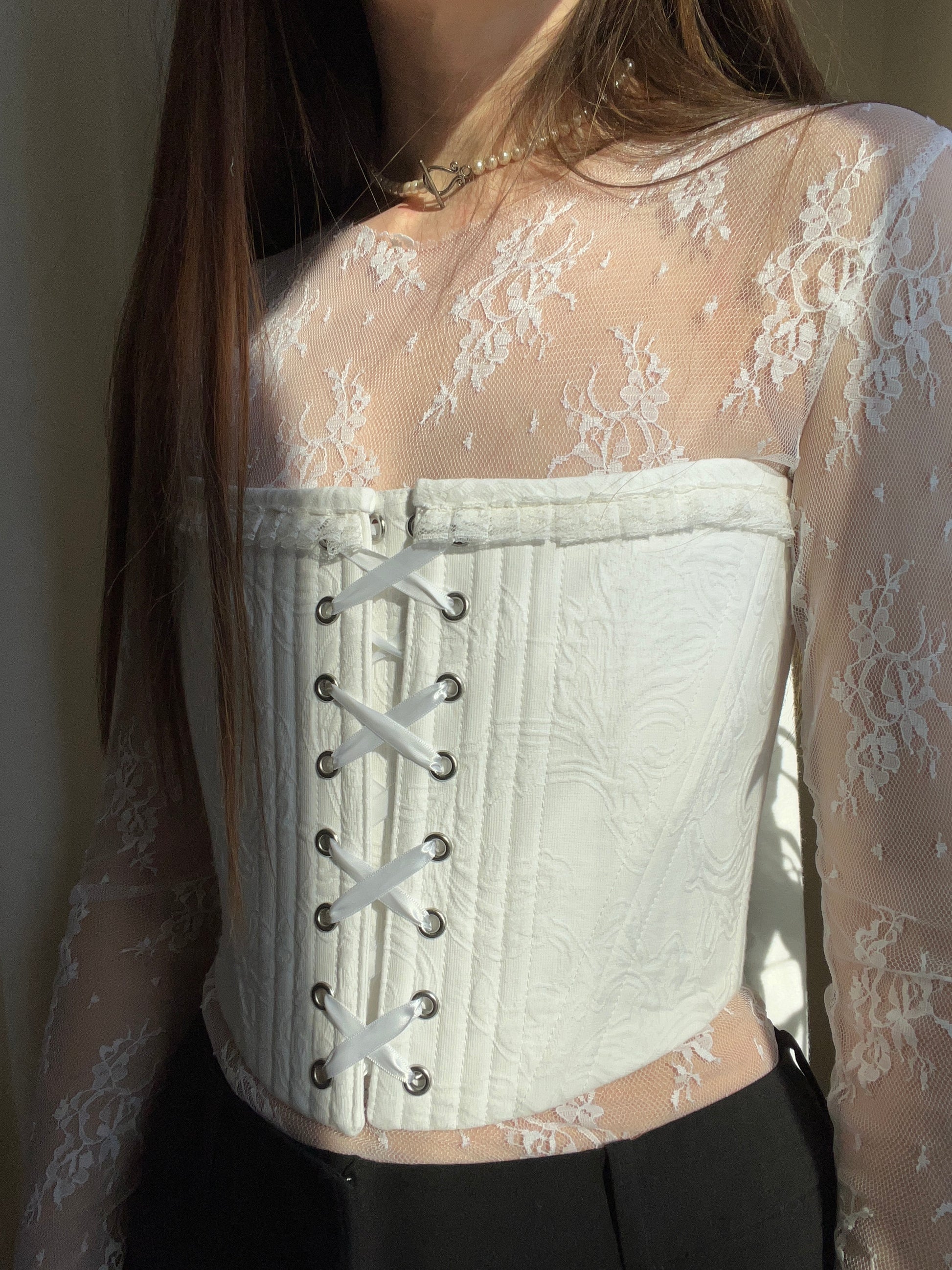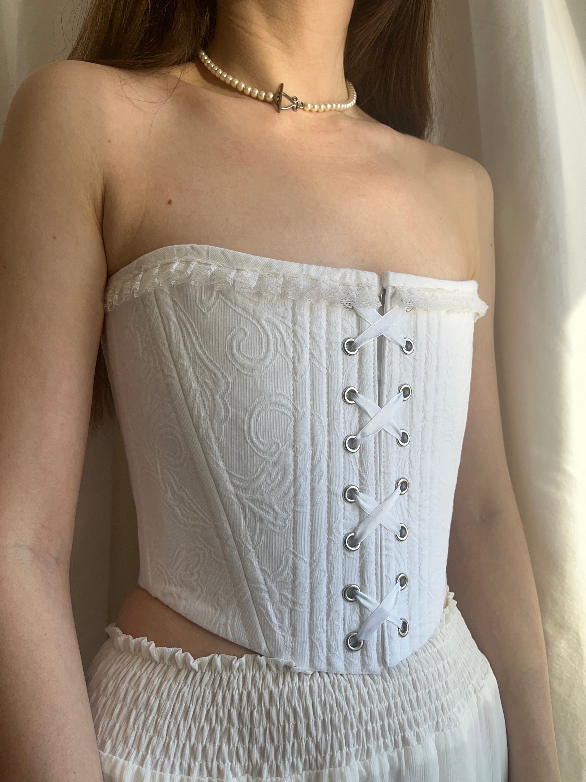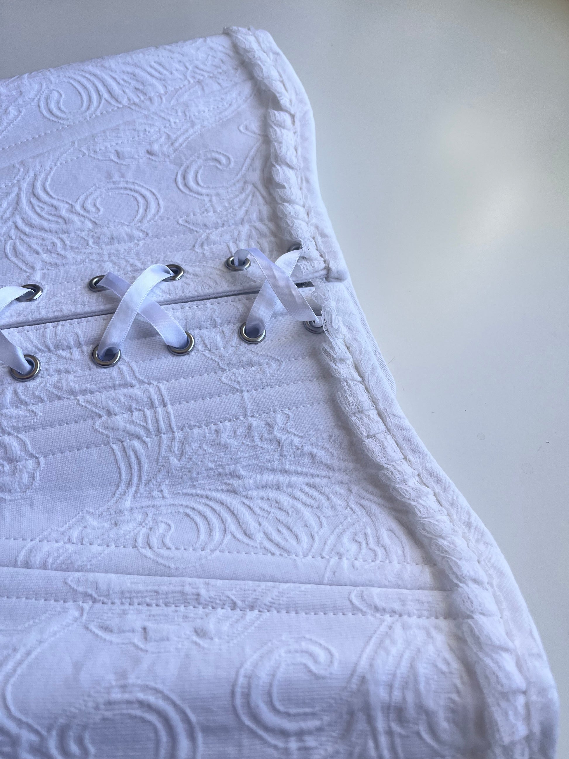 This one-of-a-kind piece is created from upcycled 100%cotton, thoughtfully selected and reimagined. Lined with 100%organic cotton twill and structured with German synthetic boning for balanced support and refined silhouette. Finished with brass grommets, satin ribbon lacing at the front and back, and hand-sewn trim along the top edge. Designed with front and back modesty panels for comfort and coverage. Only one made. Slow fashion, designed with intention.
